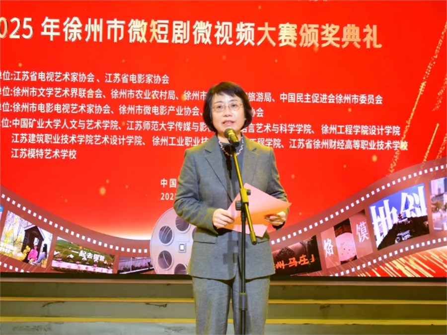 郭开芬在致辞中热情回顾了短视频大赛走过的三年不平凡历程,指出赛事的成功举办,不仅是艺术的竞技与交流,更是以文艺形式挖掘城市文脉、助力文旅融合、服务地方发展的生动实践;每一部参赛作品都是对徐州自然生态之美、历史人文之韵及乡村振兴之果的精彩诠释和有力传播;号召广大影视艺术家和爱好者,始终葆有对这片土地的深情与对艺术的敬畏,努力创作出更多思想深刻、艺术精湛、制作精良,无愧于时代、无愧于人民的精品力作。