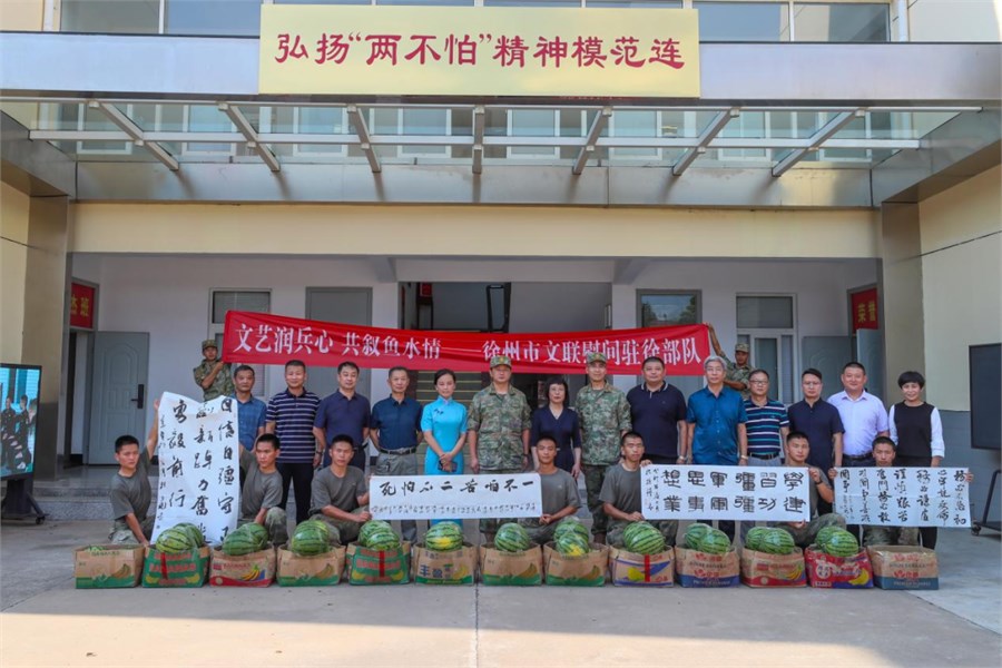 此次拥军活动,徐州市文联共为驻徐部队送去西瓜数千斤、现场创作及赠送书法作品200余幅、播放红色电影5场、演出2场,现场气氛热烈、其乐融融,生动展现了“军民一家亲”的深厚情谊,体现了徐州作为全国双拥模范城的文艺温度和担当。