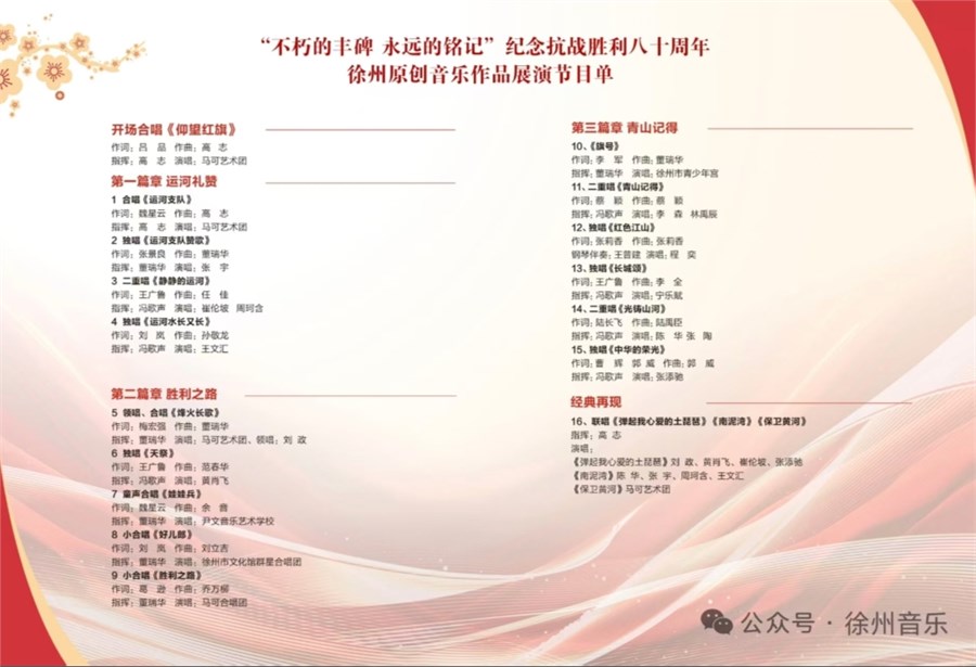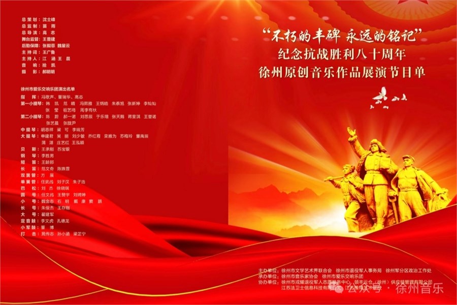 本次演出得到了徐州文联的大力支持,在徐州文联和徐州市音乐家协会的大力支持下,节目紧锣密鼓的排练了两个月。期间市文联党组成员、副主席沈士峰、徐州市音协主席苗雨,徐州市音协副主席高志多次进行艺术指导,确保演出能顺利进行。这场展演与以往的音乐会不同——所有曲目均为徐州原创,所有参与人员与单位全部公益投入。从创作到排练,从舞美到组织,参加演出的艺术团体和个人不计报酬不计时间,默默准备了好几个月,只为在中国人民抗日战争胜利80周年的重要节点,用音乐的方式向英雄的人民军队致敬。