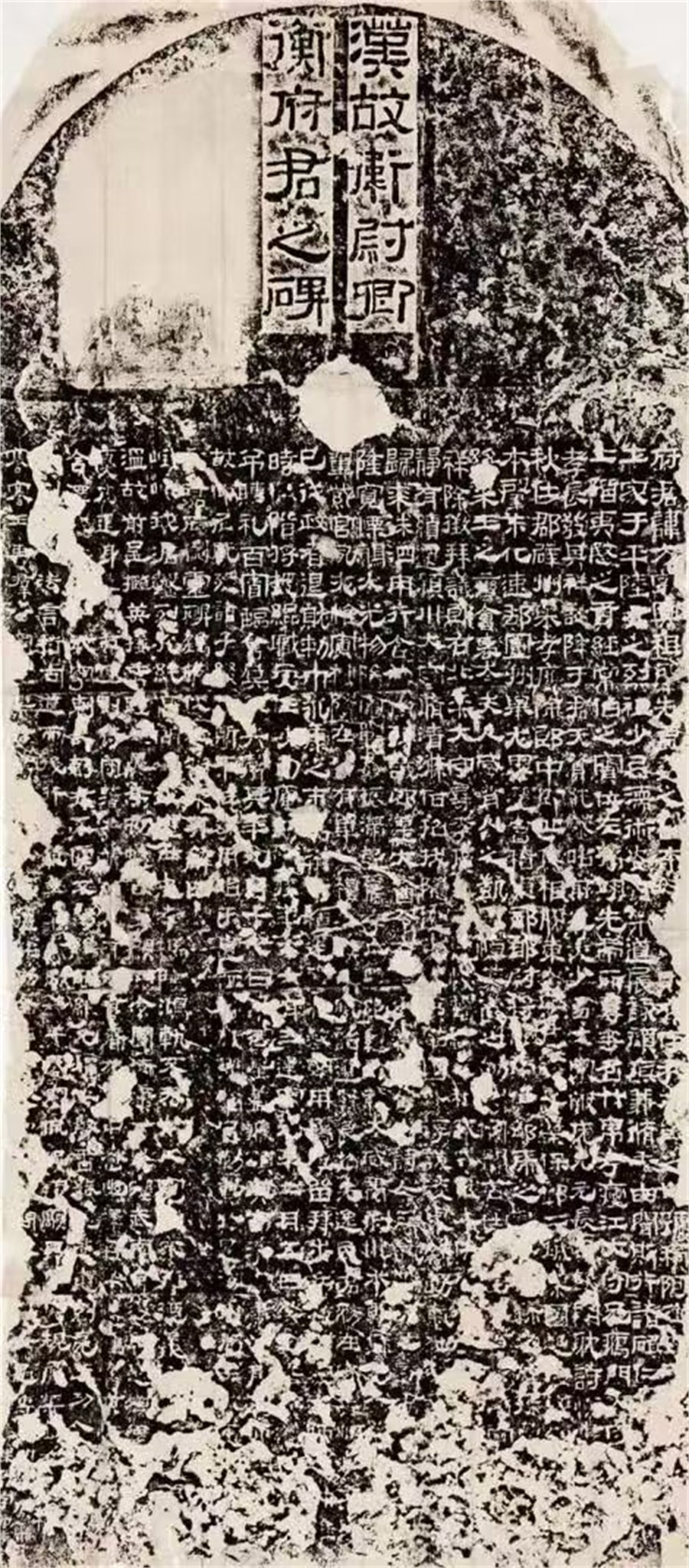 一是,《袁安碑》与东汉诸碑碑制不同。《袁安碑》立于汉安帝永元四年(117)原石残高139厘米,宽73厘米,厚21厘米。篆书十行十五列。有界格。有穿,穿在五行八行、五列八列间。《袁敞碑》与之“高广同式”,“碑石长宽厚一至。”两方碑均无碑首与碑额。而立于东汉建宁元年(168年)九月《衡方碑》(图3),高240厘米、宽110厘米,厚25厘米,有隶书碑额,为园首碑。立于东汉熹平三年(173年)四月的《鲁峻碑》(图4)高283厘米、宽115厘米,厚25厘米,有隶书碑额,圭形碑首。立于东汉延熹八年(165)十一月的《鲜于璜碑》(图5)高242厘米、宽81-83厘米,有篆书碑额两行,圭形碑首。约立于汉安二年(143)年的《景君碑》(图6)高288厘米、宽105.6厘米,有篆书碑额,圭形碑首。所举四例均为墓碑,高大而有首有额。将《袁安碑》与此相较,则高度上短1米有余,窄薄而无额无首。虽然《袁安碑》立碑时间早于以上诸碑,其形制在已经明确的东汉墓碑中没有参照,因此从制式上来言称其为碑,还缺少足够令人信服的基础。