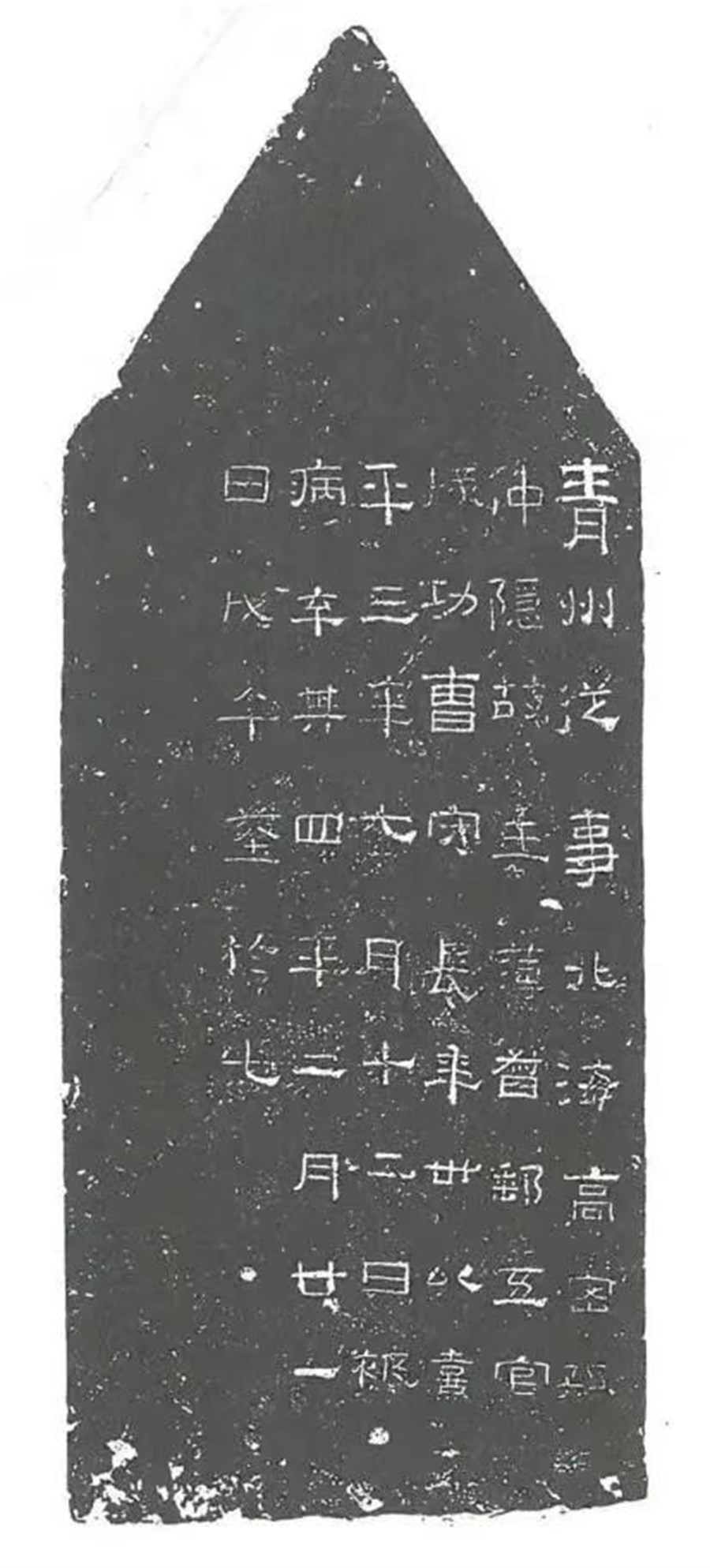 三是,《袁安碑》穿的存在不应该作为名碑的理由。《袁安碑》确有碑穿,其位置与以上所举诸碑略有不同。但是碑穿仅仅是碑制要素之一,与碑首、碑额、碑座等要素并用。叶昌炽《语石》云:“自后世立碑,但以述德叙事,而失其本义,遂不有穿矣。”《张迁碑》则无穿,而《乙瑛碑》则无穿无额。故说以碑穿的存在来确定刻石之名碑,不能成立。即使具有相似的碑形,也未必是碑。如1973年在山东高密市南郊田庄乡住王庄村调查所得《孙仲隐墓志》(图7),为东汉熹平四年(175)刻石,圭首无额,大小约88×44厘米,刻字六行,计51字。据调查当是埋幽之石,以其中文义来推测属于墓志。东晋《张镇墓志》(图8)1979年江苏吴县境内张陵山出土,志石的形状和汉碑一样,为碑形,穿、首俱全,通高51厘米,正、背均刻字,计98字。这两方墓志的共同特点是刻石尺寸小,所刻文字少,均为墓穴所出,与上述诸碑不论体量、文字数量及所处位置有明显区别。